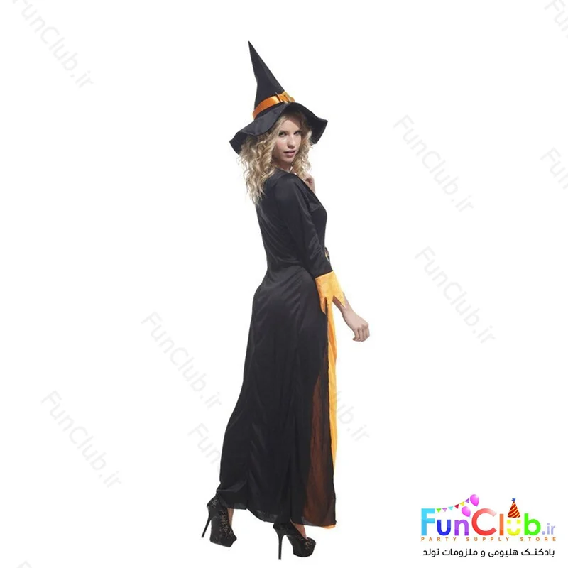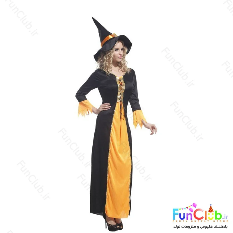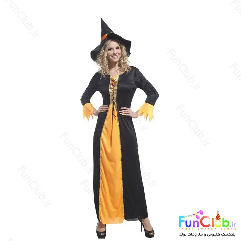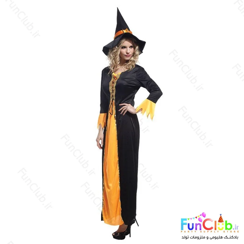 کلیه لباس ها تحت هیچ عنوان تعویض یا مرجوعی ندارند - لباس هالووین بزرگسال مدل جادوگر مشکی نارنجی