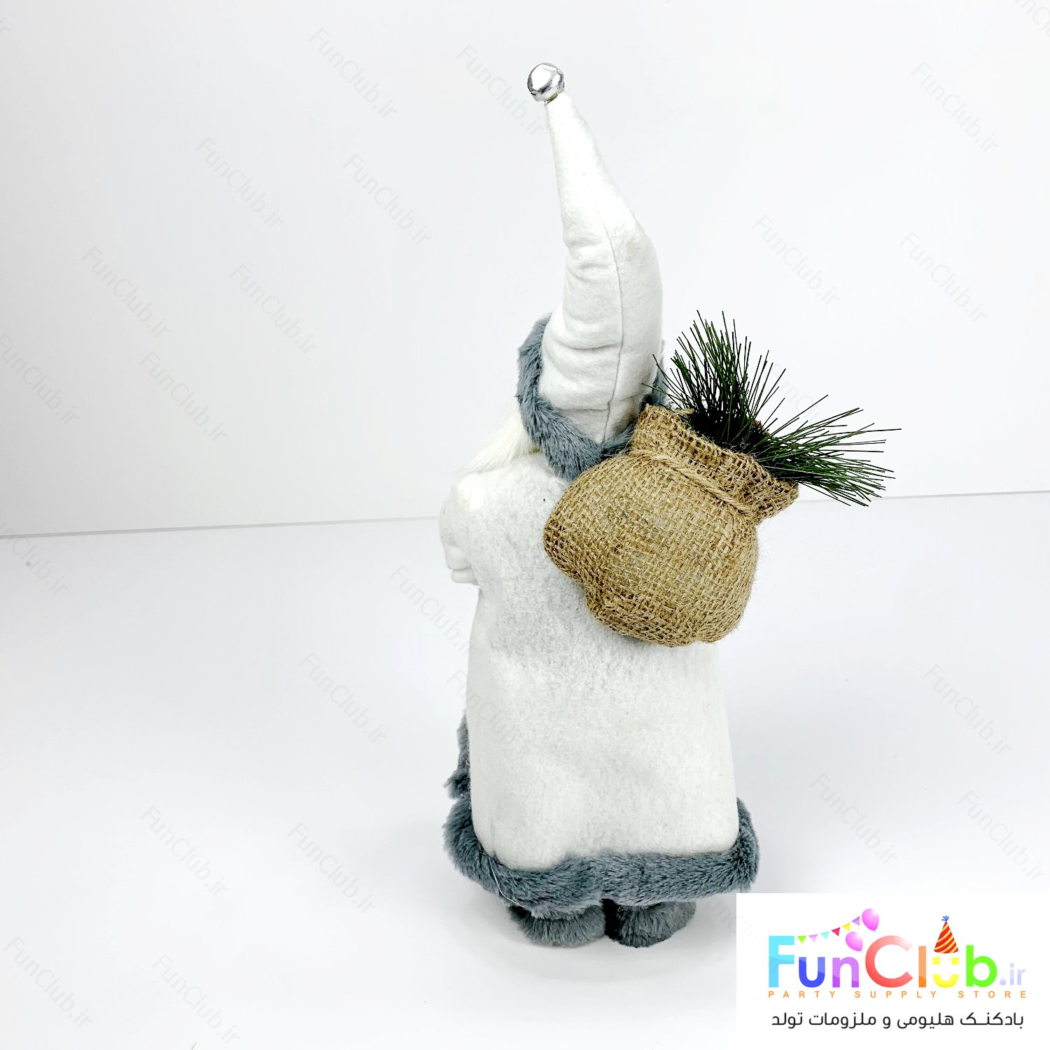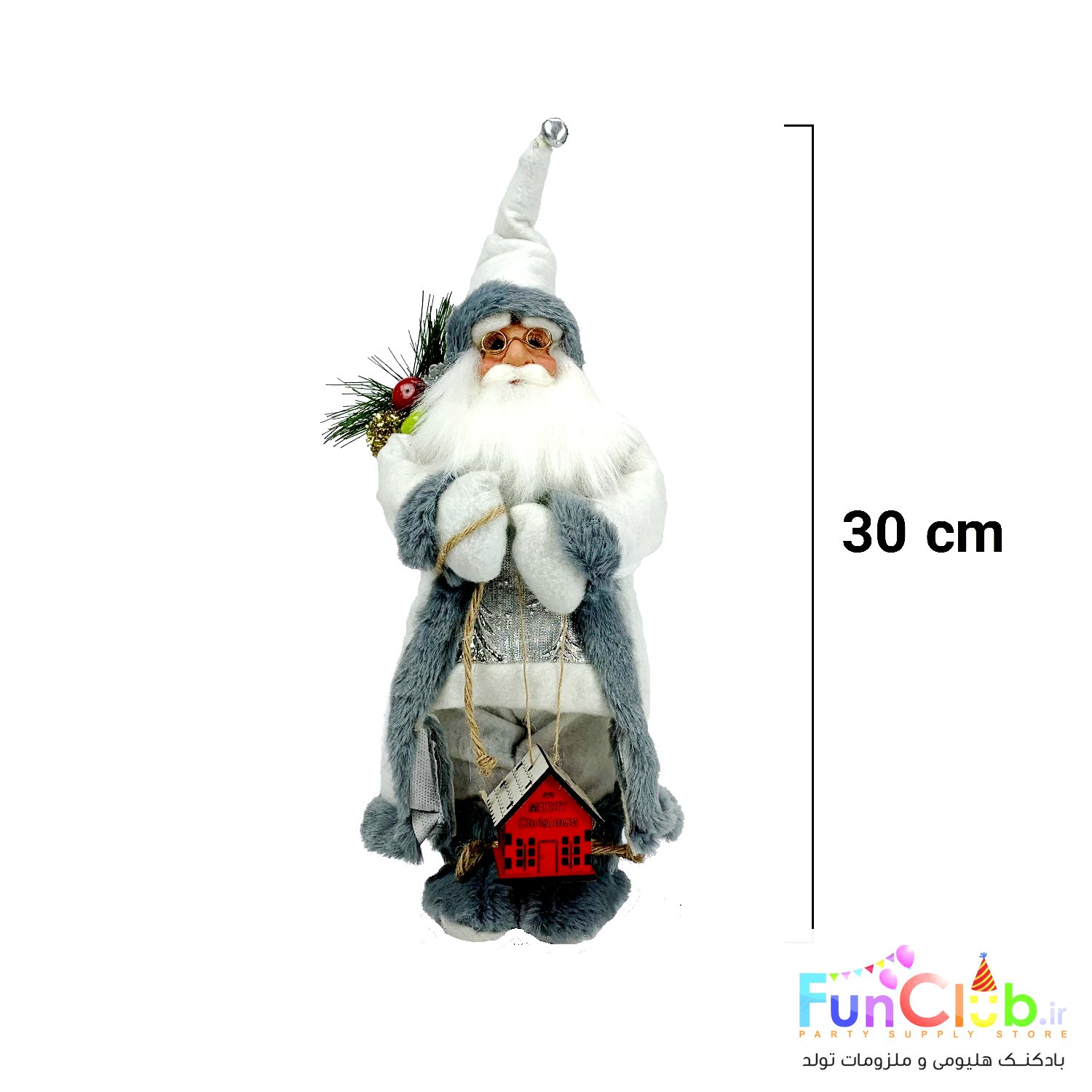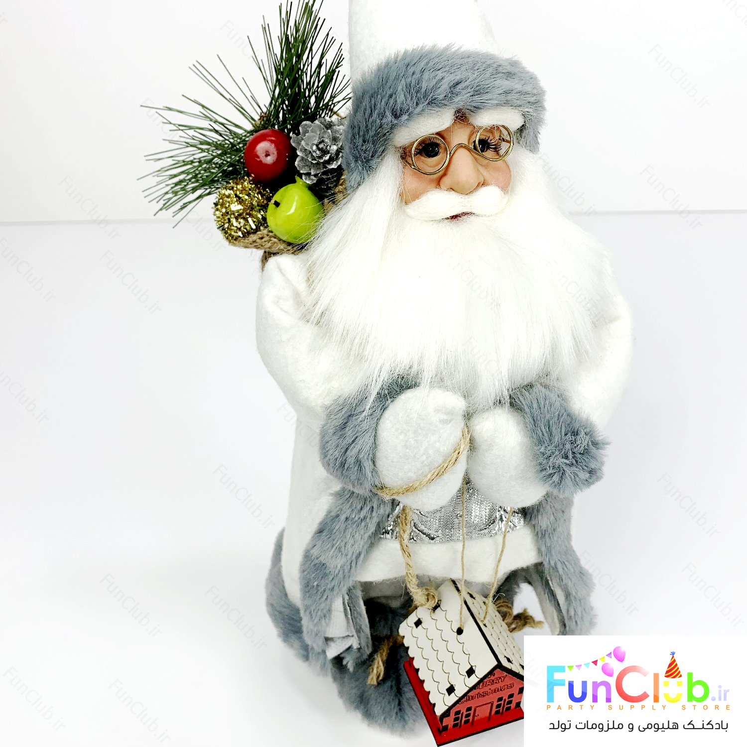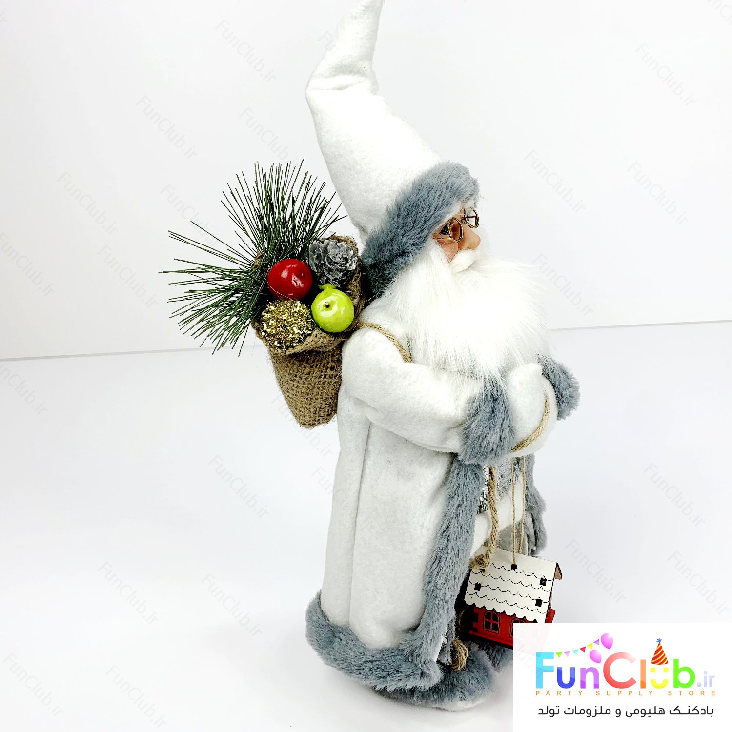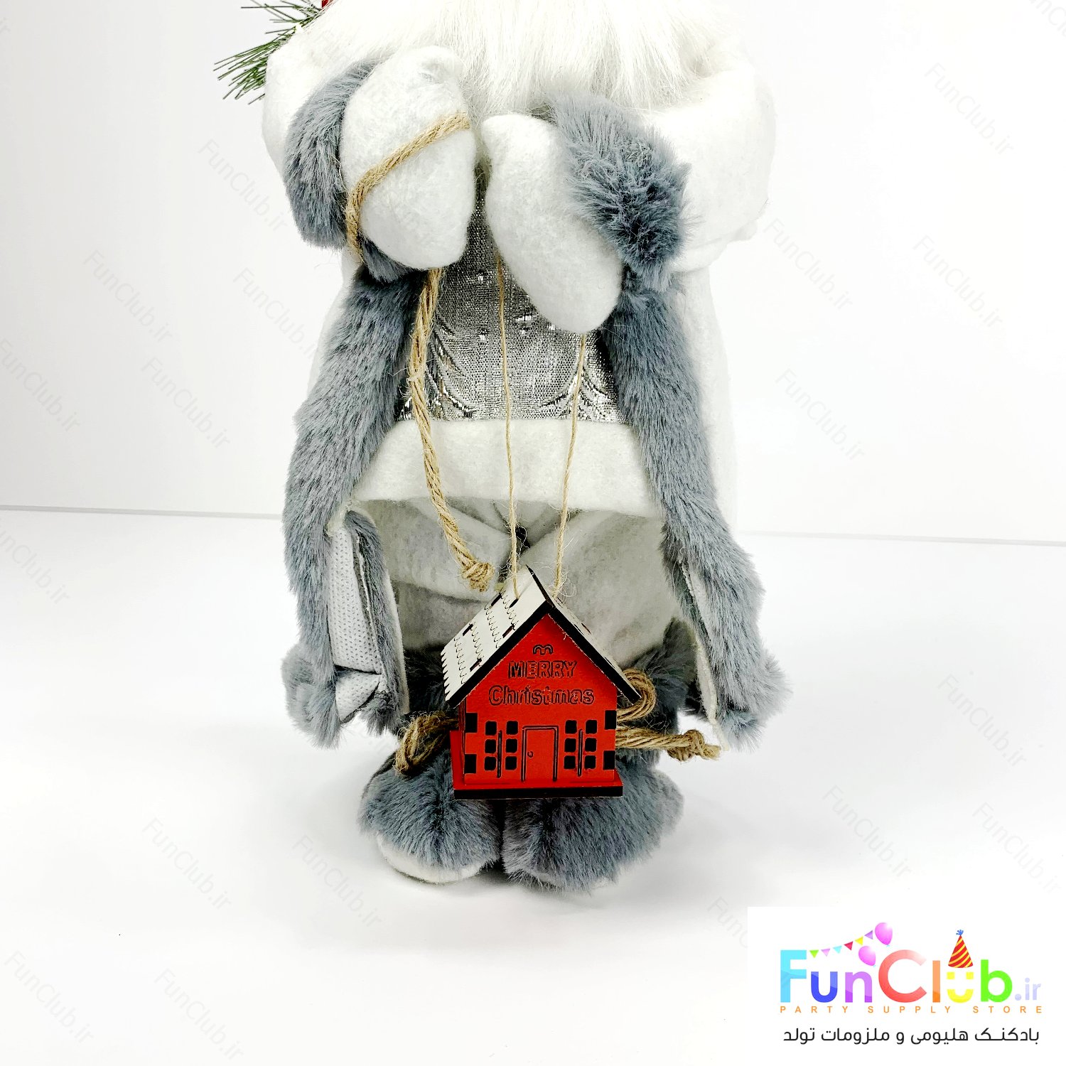 تزیین کریسمس - استند بابانوئل ارتفاع 30 سانت مدل لباس سفید نقره ای + خانه چوبی قرمز با قابلیت شکل دادن به دست ها و کلاه
