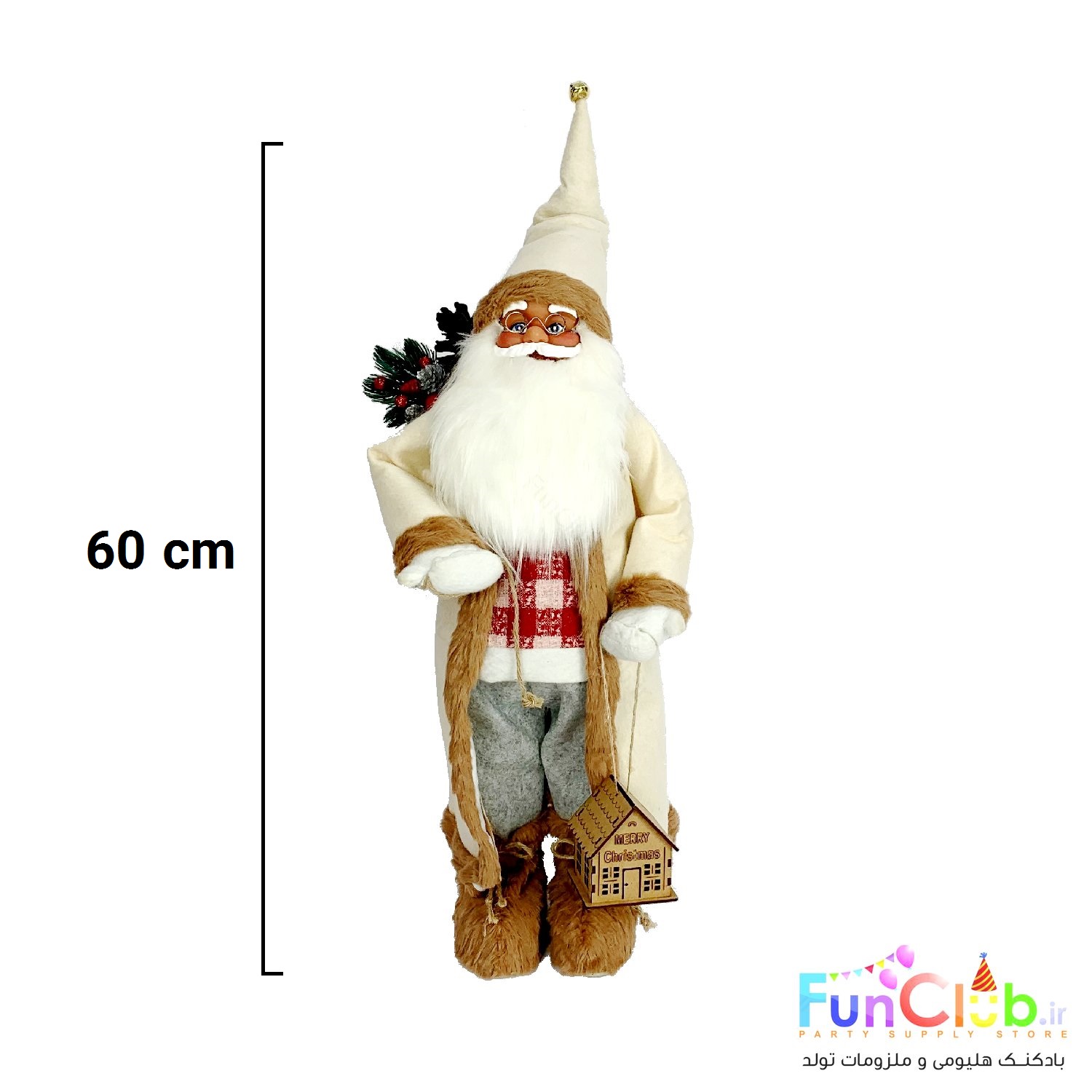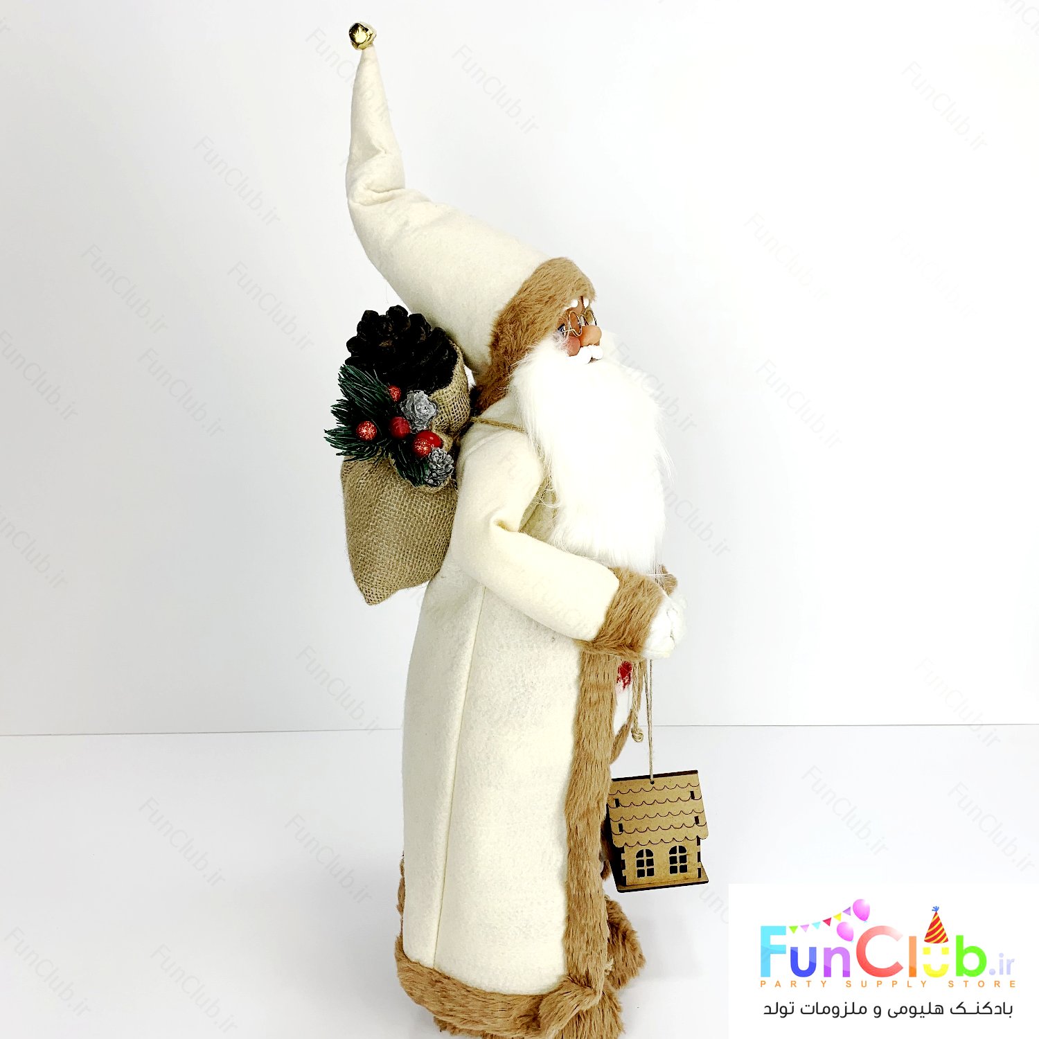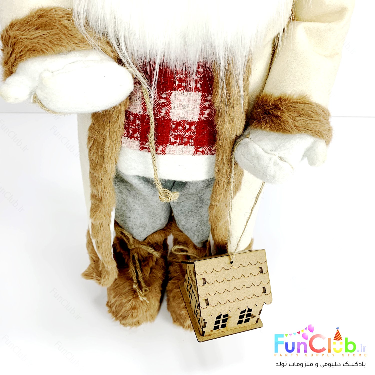 تزیین کریسمس - استند بابانوئل ارتفاع 60 سانت مدل 3 لباس کرم بلند + خانه چوبی با قابلیت شکل دادن به دست ها و کلاه