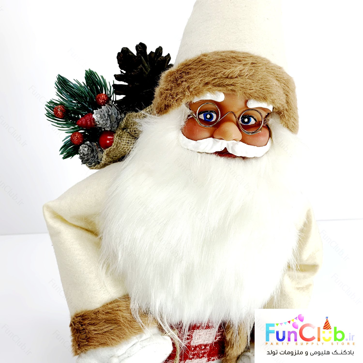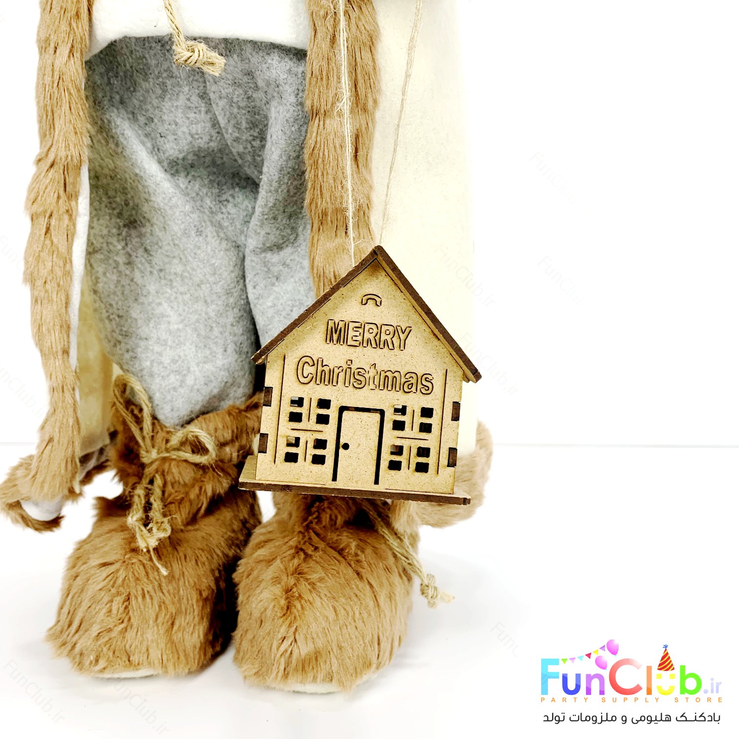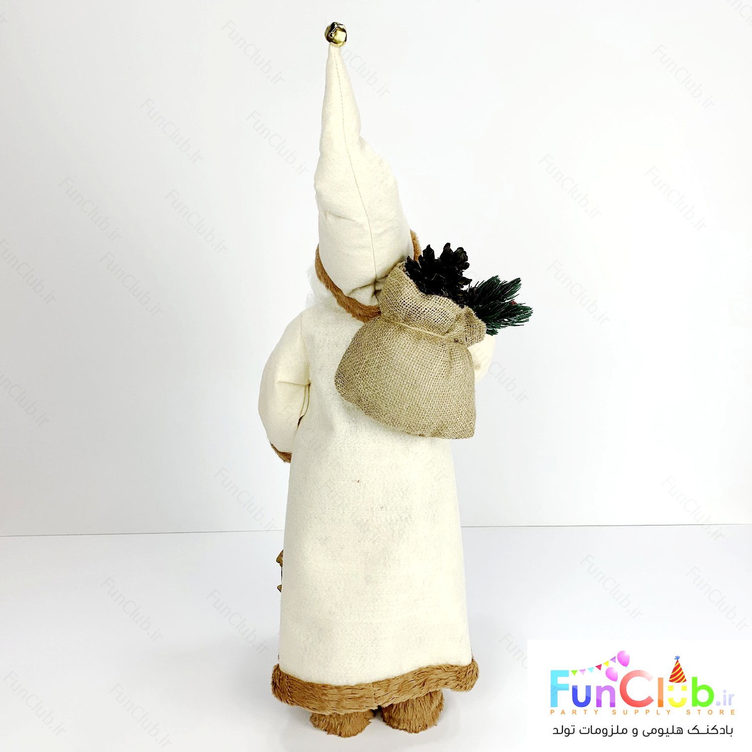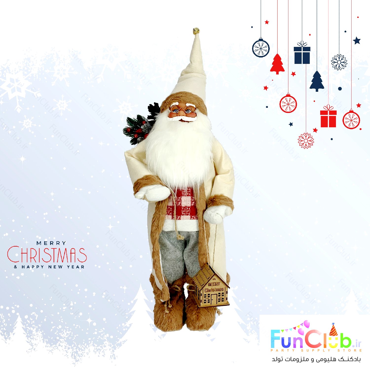 تزیین کریسمس - استند بابانوئل ارتفاع 60 سانت مدل 3 لباس کرم بلند + خانه چوبی با قابلیت شکل دادن به دست ها و کلاه