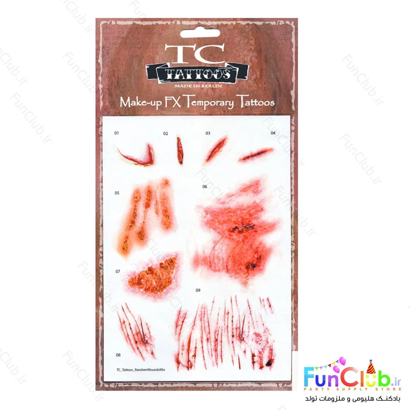 لوازم گریم - ست گریم همراه با خون مصنوعی و تتو موقت طرح زخم - ممکن است چیدمان المان های محصول با تصویر متفاوت باشد و یا شکل پالت و تتو ها حالت دیگری داشته باشد