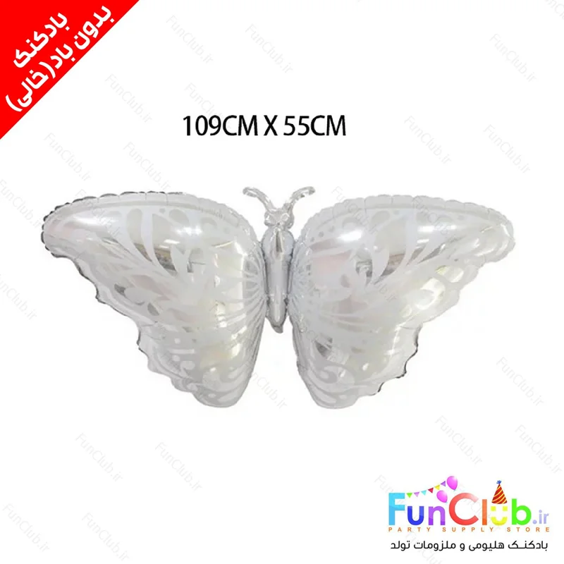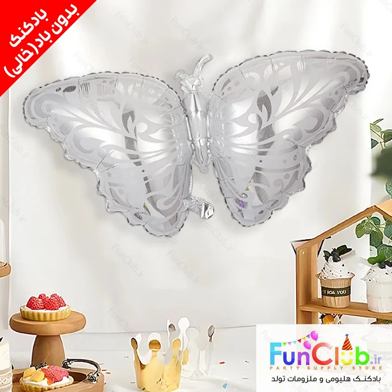 بادکنک فویلی بدون باد سایز بزرگ طرح پروانه نقره ای - این محصول ویژه پر شدن با هوا یا هلیوم در منزل توسط خریدار محترم میباشد.